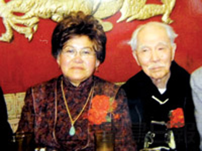 东湾屋仑华埠一位111岁高龄的长者邝永华与69岁的廖子英5月16日周日在屋仑华埠婚宴上合影。(美国《星岛日报》 韩秋萍摄)