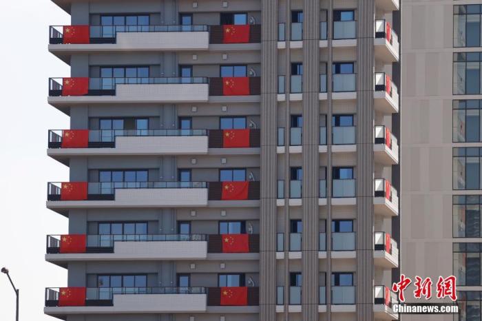资料图:当地时间7月19日,记者探访东京奥运会奥运村广场。图为中国奥运代表团入住的房间阳台悬挂中国国旗。 中新社记者 富田 摄