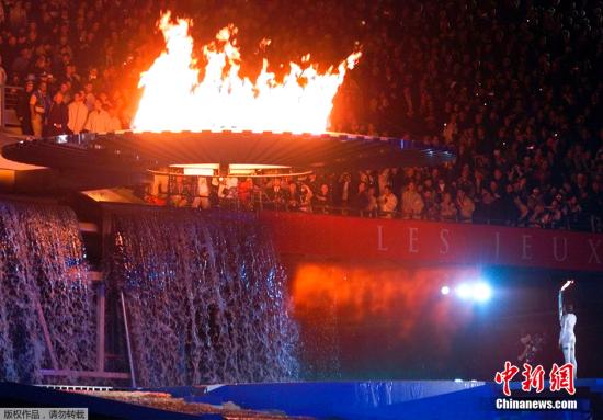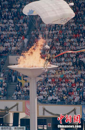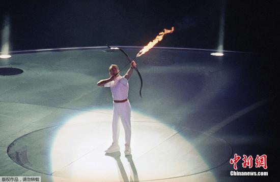 资料图:37岁的安·雷波略在离焰塔70米处用弓箭将火把射出,“射燃”了21米高塔上火炬台,点燃奥运圣火。