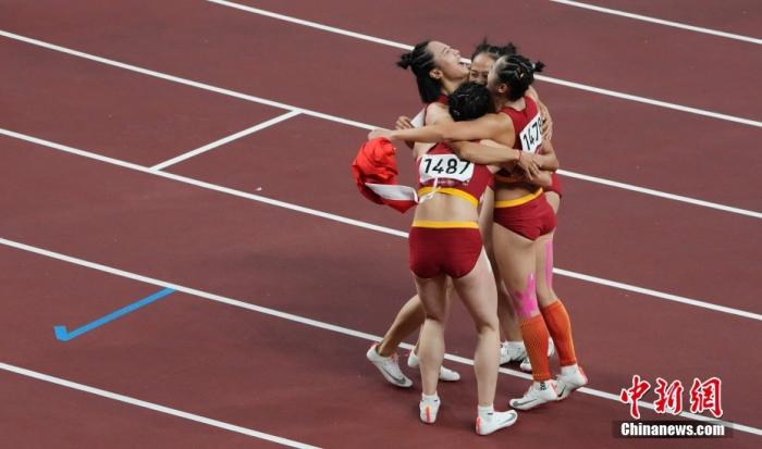 8月6日,在东京奥运会女子4x100米接力决赛中,由梁小静、葛曼棋、黄瑰芬、韦永丽组成的中国队以42.71秒获得第六名。图为赛后队员拥抱。 中新社记者 杜洋 摄