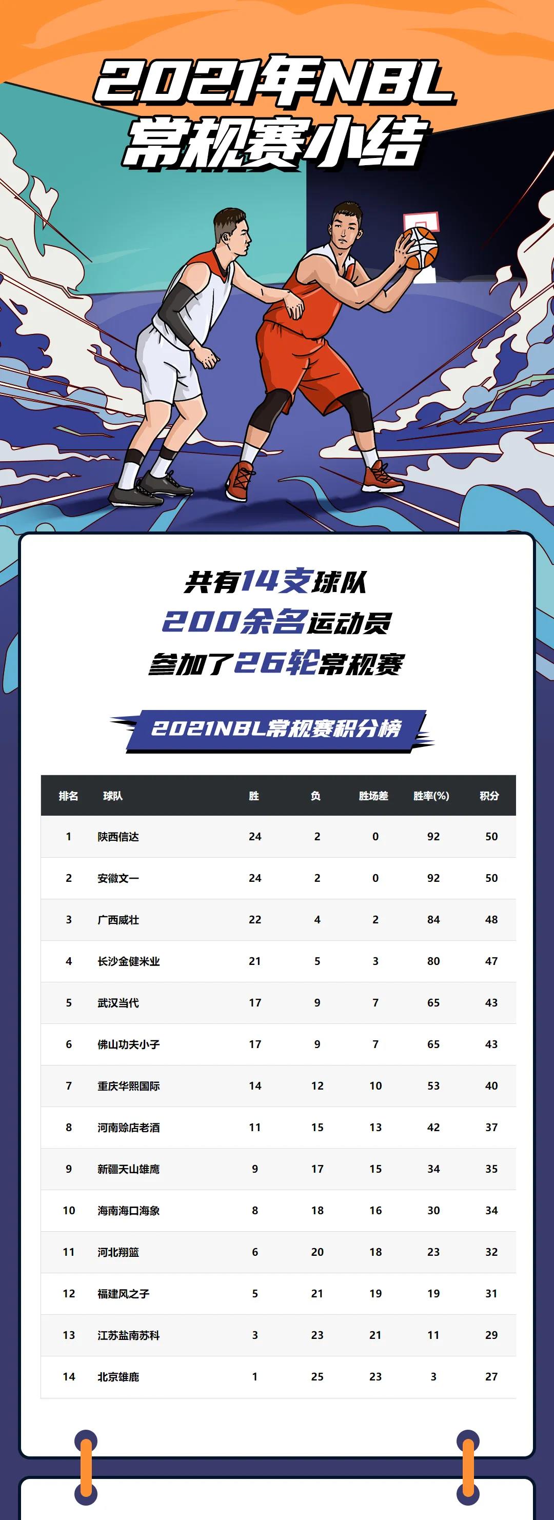 转眼NBL联赛走过25个年头。今年比赛由中国篮球协会主办,盐城市体育局、盐南高新区管委会承办,全部比赛都在盐城市体育中心盐南体育馆进行。本赛季参赛球队和往年相比,数量有所增加,从去年的11支增加到14支,其中江苏苏科雄狮和新疆天山雄鹰是首次亮相职业联赛舞台,而北京雄鹿则重回NBL大家庭。 本赛季NBL常规赛于7月11日拉开帷幕,11月9日收官,最终陕西信达、安徽文一、广西威壮和长沙金健米业四支劲旅分列常规赛前四。陕西信达和安徽文一战绩持平,同为24胜2负,彼此之间的交手也是1胜1负。但凭借着小分优势,陕西信达获得常规赛冠军,安徽文一屈居第二。广西威壮则凭借着22胜4负位居第三。获得第四名的长沙金健米业战绩为21胜5负。 常规赛排名第五到八名的球队是武汉当代、佛山功夫小子、重庆华熙国际与河南赊店老酒,这四支球队也获得了季后赛门票。新疆天山雄鹰后半程的表现也令人眼前一亮,凭借着敢打敢拼的顽强风格,新疆天山雄鹰首个职业赛季收获了9胜17负成绩,排名常规赛第九,距离季后赛仅一步之遥。 由于本赛季强强对话互有胜负,竞争激烈,因此和往年相比,最高连胜纪录“仅为”13连胜,完成这一壮举的是卫冕冠军安徽文一。从10月15日到常规赛收官,安徽文一以一波13连胜结束了常规赛征程。此外,陕西信达本赛季前12场比赛全部获胜,但第13轮不败金身遭长沙金健米业打破。 个人表现方面,场均得到27.6分的重庆华熙国际队员王思奇荣膺联赛得分王。11月7日,重庆华熙国际对阵江苏苏科雄狮,王思奇全场29投19中,砍下53分、11个篮板和6次助攻,这也是本赛季球员单场最高得分。 本赛季NBL联赛,中国篮球协会打造全新视觉体验,聘请专业高质量转播团队,比赛在多家平台进行了全场次直播,赛事品牌影响力得到提升。 在严格防疫的基础上,季后赛首轮定于11日开打。常规赛前八强捉对厮杀,陕西信达对阵河南赊店老酒,安徽文一交手重庆华熙国际,广西威壮迎战佛山功夫小子,长沙金健米业和武汉当代则狭路相逢。 根据赛制,季后赛前两轮将实行单场淘汰制。总决赛实行三局两胜制。首战将于11月15日进行,最晚将于11月19日结束。(完)