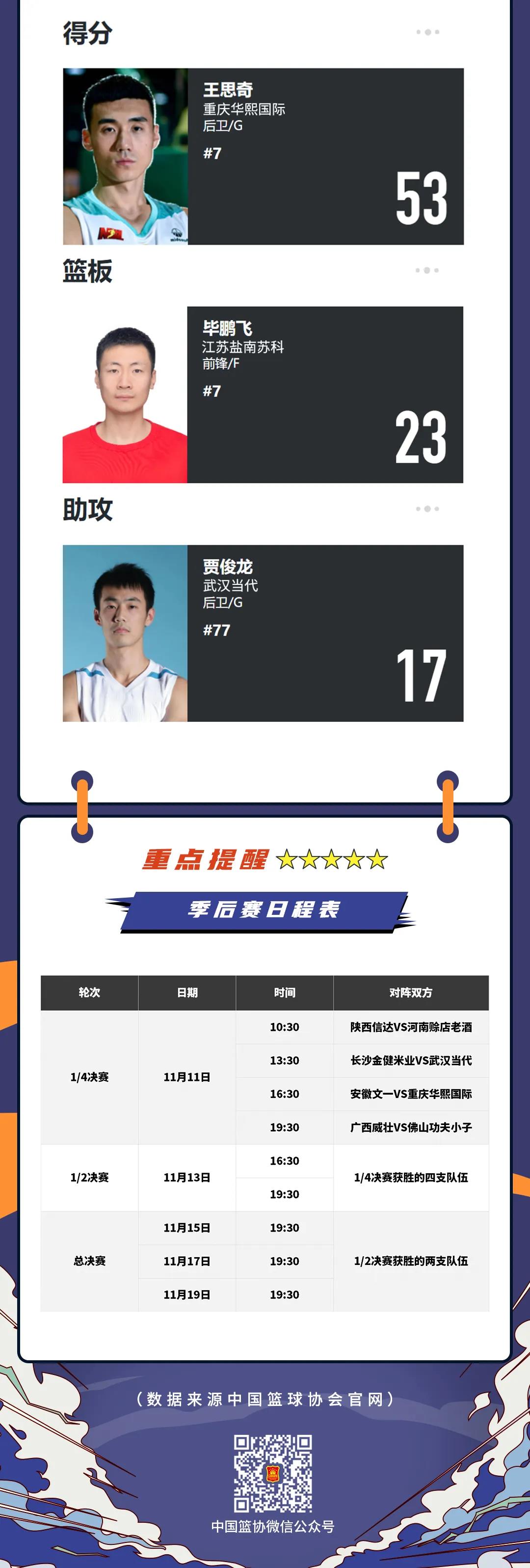 中新网11月11日电 2021全国男子篮球联赛常规赛于9日落下帷幕。历时122天,14支球队经过26轮赛事共182场对决后,陕西信达等八支球队获得了季后赛资格。