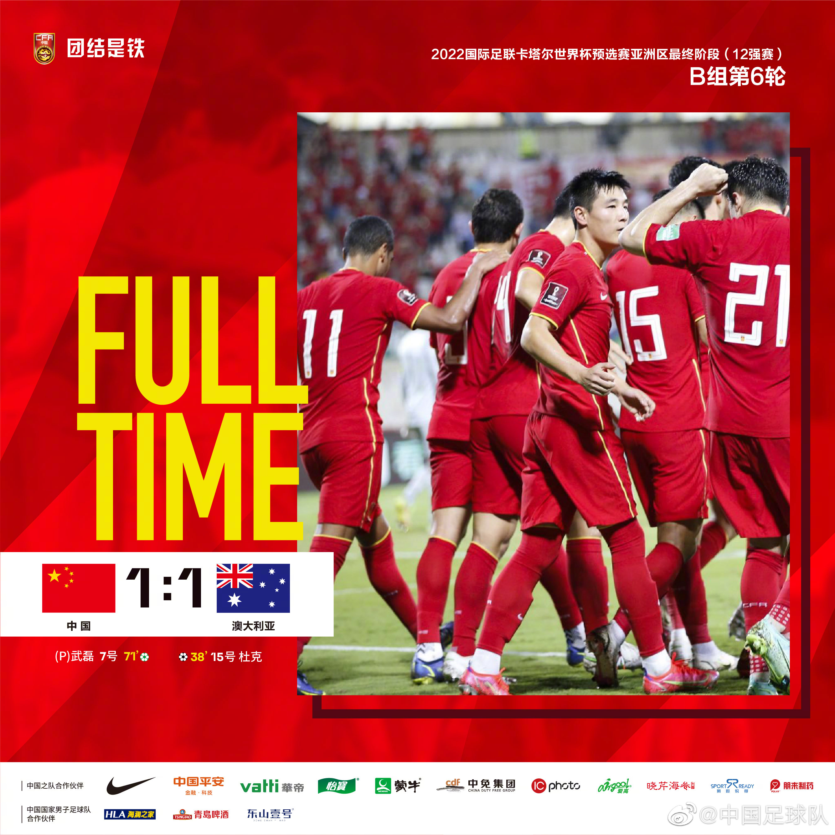 1:1战平澳大利亚后,国足成功“续命”。图片来源:中国足球队