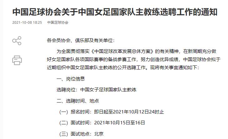 “反转”的决定 所谓觉得突然,主要源于此前的选帅流程。 早在10月8日,中国足协就发布了中国女足国家队主教练选聘工作的通知,并在10月15日和16日进行了面试工作。 有消息称,担任中超广州城足球俱乐部领队的肇俊哲、U19国青女足主帅王军、前U16女足国少队主帅陈婉婷、陕西女足主帅刘华娜、率领中国女足征战雅典奥运会的教练张海涛参与竞选。率领中国女足奥运选拔队在全运会夺冠的教练水庆霞并未参加竞选。