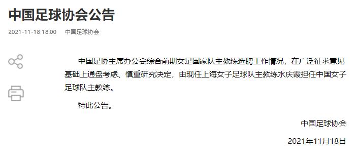 “中国足协主席办公会综合前期女足国家队主教练选聘工作情况,在广泛征求意见基础上通盘考虑、慎重研究决定,由现任上海女子足球队主教练水庆霞担任中国女子足球队主教练。” 18日晚,中国足协的一纸公告,让一个多月以来悬而未决的中国女足帅位终于有了答案。