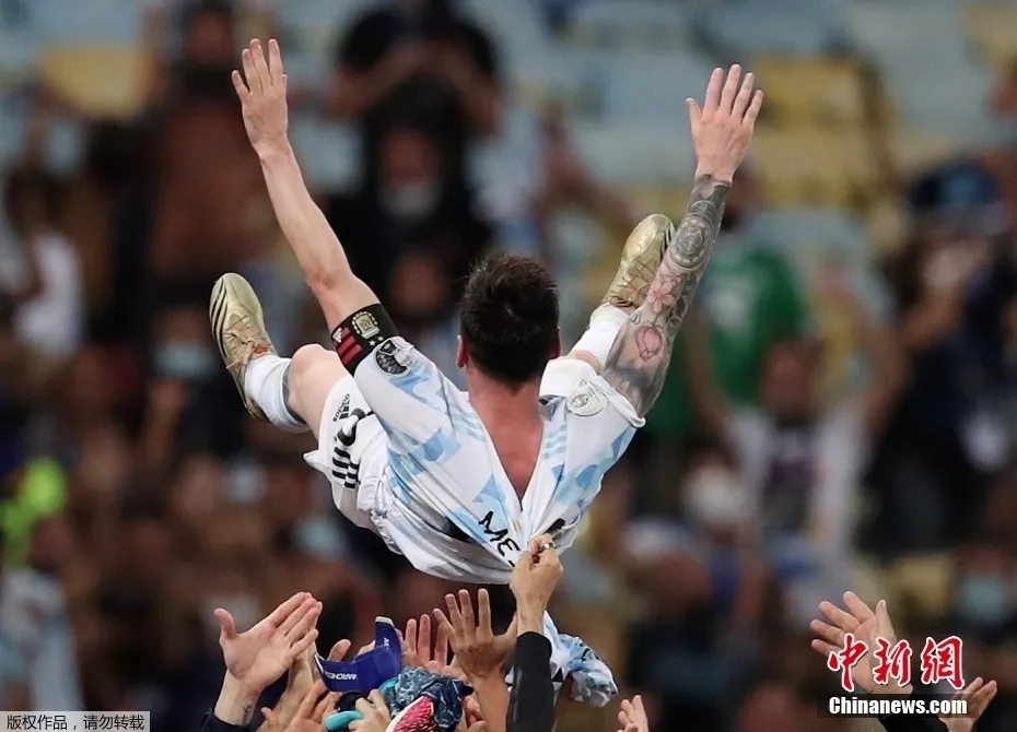 北京时间7月11日上午,在巴西进行的2021年美洲杯决赛中,凭借迪玛利亚的进球,阿根廷队1:0战胜巴西队获得冠军。图为阿根廷夺冠后梅西被队友高高抛起。