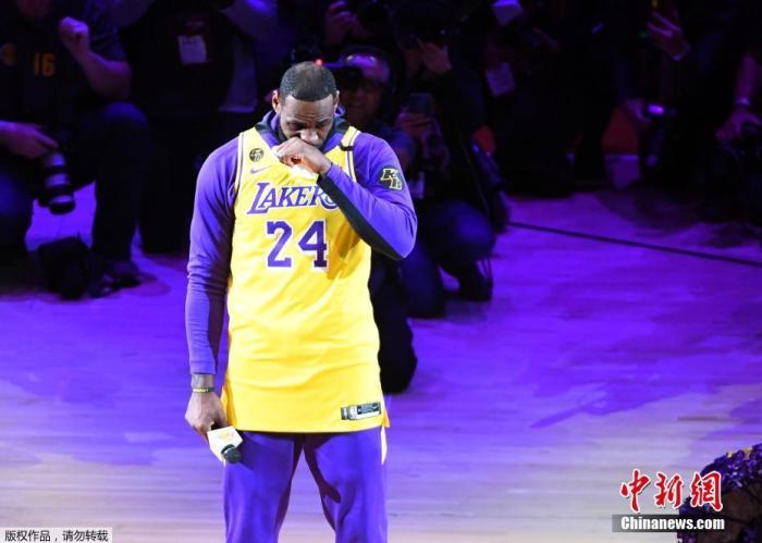 资料图:2020年2月1日,洛杉矶湖人队迎来了科比离世后的首场比赛,球队在赛前以一场追悼仪式纪念传奇科比。詹姆斯在致辞时不禁流泪。