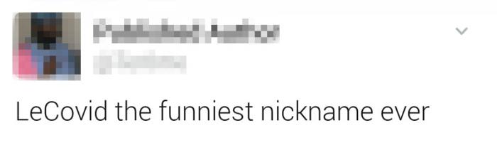 这真是关于他的唯一一件好事 有人幸灾乐祸地说:“这是关于他的唯一一件好事”。还有恶搞网友给詹姆斯起了个绰号“勒新冠”,并表示,这是他听过最搞笑的绰号。