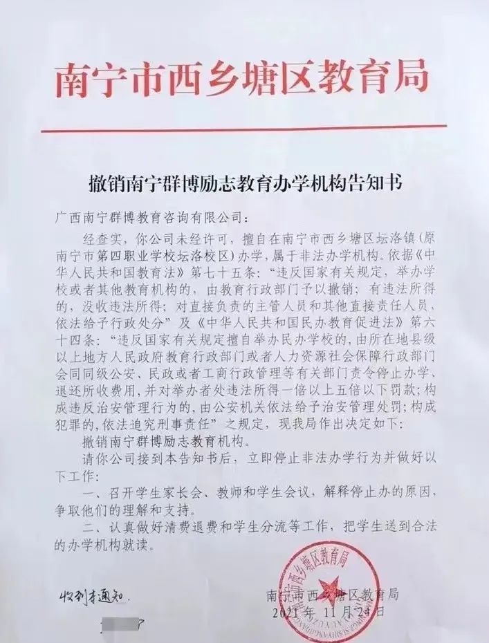 在禁闭室内,李文度过近20天。关进“小黑屋”是接受“改造”的第一关,学生每喊叫一次,便会挨棍棒训诫。如厕的工具是被反复使用过的塑料盆,吃的是有馊味的米饭和馒头,睡在发黑的垫子上。 全文6353字,阅读约需12分钟 新京报记者 咸运祯 编辑 袁国礼 校对 李立军 11月29日,14岁的李文沉浸在游戏中,一边快速地按动着手机游戏中的控制键,一边讲述着自己在群博励志学校的遭遇。 身上的淤紫伤已经退去。“他们都应该进监狱”,说这句话时,李文红了眼眶,声音颤抖起来。极力“伪装”的不屑仿佛在一瞬间消失,剩下的,只有一个14岁少年的恐惧和无助。 不间断的言语辱骂,随时可能落在屁股上的警棍,分不清昼夜的禁闭室,长达八小时的体罚——2021年11月,20名未成年学生共同发声,举报广西南宁群博励志教育学校(以下简称为群博励志学校)涉嫌暴力“矫正”。 群博励志学校位于广西壮族自治区南宁市西乡塘区一个不知名的景区内,距南宁市区约30公里。选址十分偏僻,除当地村民外,鲜有外人造访。 截至今年,已有近2000名学生报名群博励志教育学校。根据学校官网数据,其中95%以上为未成年,男女生比例为2:1,年龄最小的仅8岁。被限制自由的300多天里,有学生试图翻越五米高的双层铁丝网,或者通过吞洗发水获得就医机会等方式出逃。对他们来说,这是一所“集中营”,而自己则是深困其中的“囚犯”。 非法办学机构在声讨中被陆续关停,但类似群博励志学校这样的“矫正机构”则从未沉寂。早在2019年及2020年,南宁市西乡塘区教育局就已先后两次因擅自招生办学,对其下发整改通知书及撤销机构告知书。但时隔不久,群博励志学校便更换校址,卷土重来。12月2日,新京报记者从南宁市西乡塘区教育局获悉,当地再次下发撤销告知书,要求群博励志学校立刻停止非法办学行为,并做好学员的遣散和安抚工作。涉及违法的,将依法移交司法机关查处。 ━━━━━ 被押送的“脱轨”少年 “速度推塔,你走边路”——14岁的男孩李文不断向记者展示着自己的游戏技巧。屏幕前,他领导着全局,不断击退对手,直到冲破高地,敌方的水晶被摧毁。 半个小时一局的游戏,是李文最兴奋的时刻,那是在现实世界里从未感受过的成就感。 一年前,刚从小学升入初中的李文,迷恋上手机游戏。在游戏中一路通关之余,还成为一名拥有百万粉丝的游戏博主。 逐渐地,李文失去了对时间的掌控,不写作业、厌学,学习成绩一落千丈,后来索性不去学校。整日躲在房间里打游戏,构成生活的全部。 为阻止儿子打游戏,李文的父母想尽一切办法:切断网线、将手机藏起来,寸步不离地看守。原本充满欢声笑语的家庭,日日充斥着亲子间的博弈与争吵。 2020年12月16日晚上,李文和往常一样将房门反锁,戴上耳机,准备在游戏世界中尽情释放多巴胺。 “咚咚咚”一阵敲门声,成为李文“噩梦”的开始。“他们说要带我去管教学校训练,我不同意,那两个男的就按住我的脖子。”李文回忆,挣扎一阵后,李文被推搡着下楼, “押”上一辆白色面包车。 从广州家中到南宁有四个多小时的车程,李文的双手被一根粗麻绳绑住。稍有反抗,就有人捏他的手臂,直到疼到失去知觉。李文不敢睡觉,一双眼睛紧盯着结满水雾的车窗,一辆辆模糊的车影飞驰而过。 ▲该学校被指让男学员冬天集体在宿舍前罚站,不允许睡觉。受访者供图 类似经历的还有孙晓雪。2021年3月7日,星期日,是孙晓雪16岁生日。与家人吃过庆生午饭后,她被父母“骗”上了车。 情窦初开的孙晓雪是日漫的发烧友。因与班上一名男生有共同的爱好,二人走得较为亲近,也因此让家长倍加紧张。 “他们跟踪我,只要放学晚回来半小时,他们就会骂我不知道脸羞。”孙晓雪觉得父母多疑又敏感,经常趁自己洗澡或是睡着的时候,偷偷解开手机密码,查看聊天内容。 夜不归宿、泡吧、学抽烟成为孙晓雪报复的方式,父母因此与之争吵,一家人的关系落至冰点。 和李文、孙晓雪同期被送进群博励志学校的,还有45名学生。在父母眼里,他们是难以管教的“脱轨”少年:有的上网成瘾、有的打架逃学,有的甚至已经休学。 根据群博励志学校官网数据,截至今年,已有近2000名学生报名,其中95%以上为未成年,男女生比例为2:1,年龄最小的仅8岁。 ━━━━━ 失去自由的365天 暴力,是群博励志学校留给少年们的共同回忆。 来到群博励志学校的第一天,李文被按在椅子上,一把陈旧的电推子,在头皮上来回滑动,李文的头发被全部剃掉。在上交手机等私人物品后,李文被分配给一名韦姓“教官”。 教官命令李文脱下衣服后,塞过来一套迷彩服。接着,李文被关进一间封闭的屋子。 李文回忆,在大约一百来平方米的空间里,有一扇被双层铁丝网钉死的窗户,阳光只能从墙上两个巴掌大小的洞中照进来,那是小黑屋里唯一的通风口。被关进去时,里面还有二十几个年龄相仿的男生,低着头,席地而坐。 密闭的环境使李文变得狂躁起来。一阵拍墙、骂人、喊叫后,负责看管的韦姓教官将其带离小黑屋,黑色的棍子连续几下猛抽在屁股和腰上,李文“疼得站不起来”。 “只要有一点反抗就会揍你,轻的时候打屁股,严重的时候哪里都会打,看教官的心情,打到你服为止。”李文回忆。 在禁闭室内,李文度过近20天。关进“小黑屋”是接受“改造”的第一关,学生每喊叫一次,便会挨棍棒训诫。如厕的