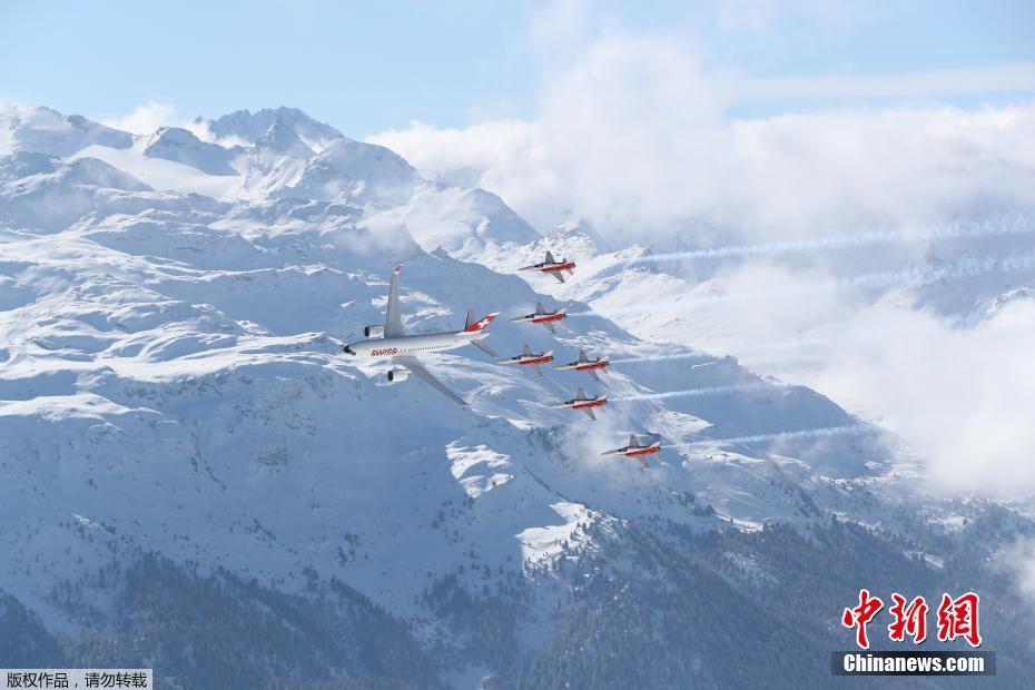 资料图:2017年高山滑雪世界锦标赛在瑞士圣莫里茨举行,瑞士空军的“巡逻兵”飞行表演队上演雪山飞行助阵开幕式。