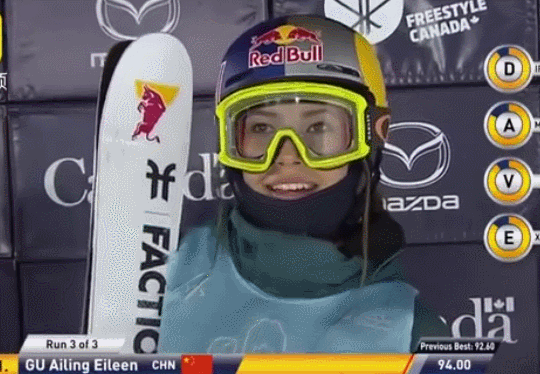 谷爱凌从近50米高的斜坡滑下,冲上跳台,在空中翻转,最后落地。她无比熟悉的一套动作完成,得到了94.50的高分,现场响起一阵喝彩。