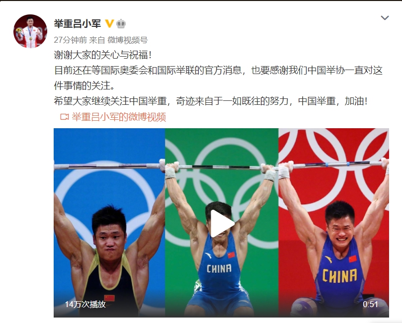 “谢谢大家的关心与祝福!目前还在等国际奥委会和国际举联的官方消息,也要感谢我们中国举协一直对这件事情的关注。希望大家继续关注中国举重,奇迹来自于一如既往的努力,中国举重,加油!”在个人社交媒体中,吕小军这样说道。 6年前的里约,吕小军在男子举重77公斤级比赛中,以总成绩379公斤夺得银牌。在抓举阶段,他第3把要了超世界纪录的177公斤,并成功举起。抓举落后吕小军12公斤的哈萨克斯坦选手拉希莫夫,在挺举阶段挑战214公斤成功。他由此打破挺举世界纪录,并凭借体重优势逆转夺金。