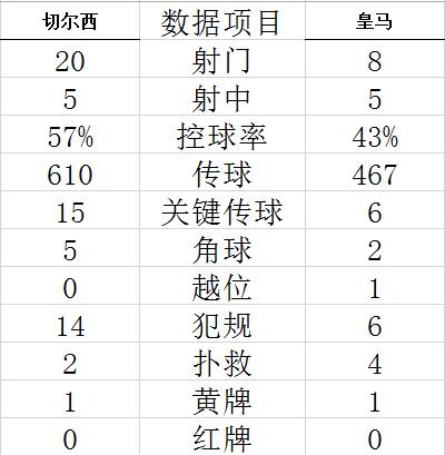北京时间4月7日03:00(英国当地时间6日20:00),2021/22赛季欧冠1/4决赛首回合展开争夺,皇家马德里客场3比1力克切尔西,本泽马上演帽子戏法,哈弗茨扳回一城。 切尔西此前5次欧战对阵皇马取得3胜2平保持不败。切尔西此前21个欧战主场对阵西班牙球队取得11胜7平3负,皇马此前19次做客英格兰取得6胜5平8负。普利西奇、芒特、詹姆斯、若日尼奥和克里斯滕森轮换出场。皇马仅用巴尔韦德和卡瓦哈尔轮换出场。 第21分钟,本泽马直传,威尼修斯禁区左侧传中,无人防守的本泽马12码处冲顶入网。第24分钟,摩德里奇右路传中,本泽马小禁区前头球破门,2-0。切尔西第40分钟扳回一城,若日尼奥直传,哈弗茨小禁区边缘冲顶入网,1-2。