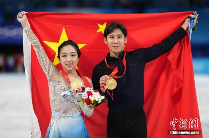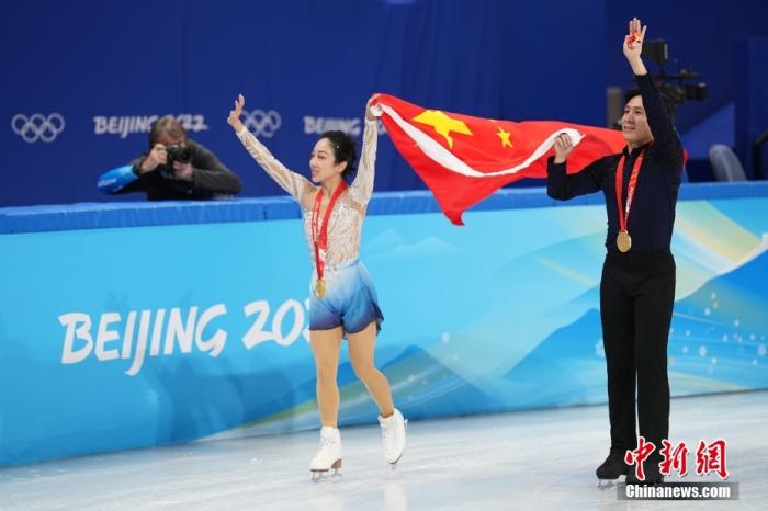 2月19日,中国组合隋文静(左)/韩聪在比赛后手举五星红旗滑行。当日,北京2022年冬奥会花样滑冰双人滑自由滑比赛在首都体育馆举行,中国组合隋文静/韩聪夺得双人滑冠军。 中新社记者 崔楠 摄