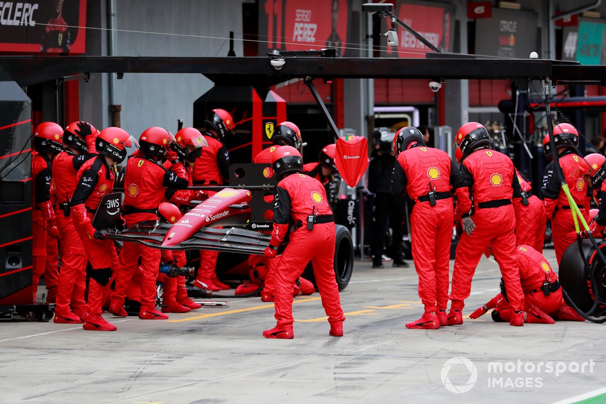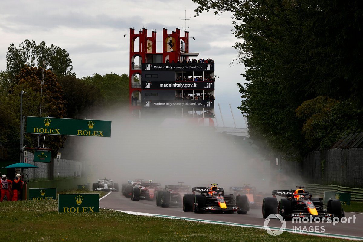 法拉利在前三场取得两场胜利后高居两个积分榜头名宝座。面对在伊莫拉的本赛季第一个主场比赛,两辆赛车从前两排发车,让他们有机会为兴奋的Tifosi奉献他们想要的结果。然而,比赛一头一尾的两次意外,让跃马经历了一场梦魇。 虽然临近比赛开始时已经不下雨,但赛道还是湿地状态,所有车手都用半雨胎开始比赛。五盏红灯熄灭后,莱克勒克启动稍慢,被佩雷兹和诺里斯超越,落到了第四。就在赛车扎堆通过全场第一个减速弯2号弯时,卡洛斯·塞恩斯被身后的丹尼尔·里卡多顶到后,连续两场比赛早早退出争夺,而澳大利亚人也在回到赛道后落到了最后一位。为了清理塞恩斯的法拉利赛车,赛会派出安全车,直到第五圈结束。比赛重新开始后,两辆红牛领跑。莱克勒克在第八圈超过诺里斯后,猛追佩雷兹。 随着比赛的进行,赛车线逐渐变干。先前更换过一套半雨胎的里卡多,在第16圈第一个进站换上干胎。而一圈后,红牛赶在莱克勒克追上佩雷兹之前,让墨西哥人进站,而所有其他赛车也在两圈里陆续进站。
