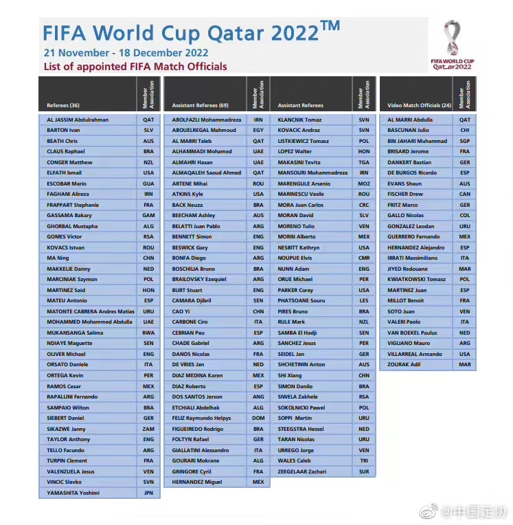 这份名单中包括36名主裁判、69名助理裁判以及24名视频比赛官员。国际足联的评选标准则是根据他们近年来在旗下足球赛事以及其他国际和国内赛事的表现和执裁水平。 国际足联裁判委员会主席表示:“我们选拔的标准向来是‘水平第一’,选定的比赛官员也代表了全球最高水平的裁判。”“2018年世界杯非常成功,部分原因是裁判判罚水平很高,我们将在几个月内尽最大努力在卡塔尔做得更好。” 此外,在国际足联世界杯历史上,国际足联裁判委员会首次任命了三名女裁判和三名女助理裁判。她们分别来自法国、卢旺达、日本、巴西、美国和墨西哥等六个国家。 “我们想要强调的是,最重要的是执裁水平,而不是性别。我希望将来为重要的男子比赛挑选优秀的女子赛事官员将被视为一件正常的事情。她们理应参加国际足联世界杯,因为她们的表现一直很优秀。”国际足联裁判委员会主席总结道。(完)