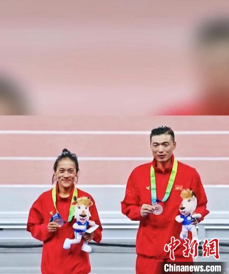 全运会领奖台上的何巫呷(左)。 盐源县融媒体中心供图