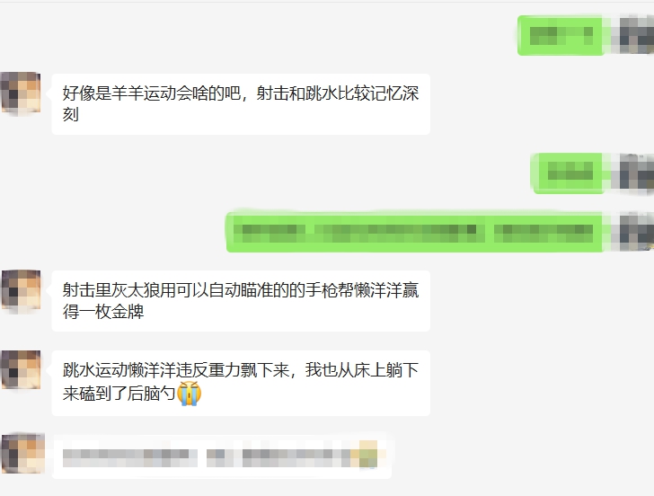 00后:《喜羊羊与灰太狼之羊羊运动会》 “可能‘00后’基本上都看过羊羊运动会,我们聊起儿时的事,总会谈起它。”正在上大二的付诚(化名)这样说道。小时候的他,便是一个不折不扣的动画迷。 在不少“00后”眼中,羊羊运动会类似夏季运动会,多个体育项目在剧中有所体现。“印象最深刻的应该是跳水。懒羊羊睡着后参加比赛,像树叶一样,轻盈地飘下来得到冠军。当时还不知道有‘重力’这回事。我自己也在床上模仿他的动作,结果磕到了后脑勺。” 付诚自嘲着当时稚嫩的自己。