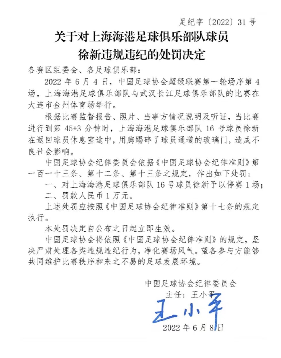 此外,中国足协还公布了对上海海港球员徐新的处罚决定。在上海海港与武汉长江队的比赛中,徐新在返回球员休息室途中,用脚踢碎了球员通道的玻璃门,造成不良社会影响。中国足球协会纪律委员会依据《中国足球协会纪律准则》第一百一十三条、第十二条、第十三条之规定, 对徐新予以停赛1场,罚款人民币1万元的处罚。(完)