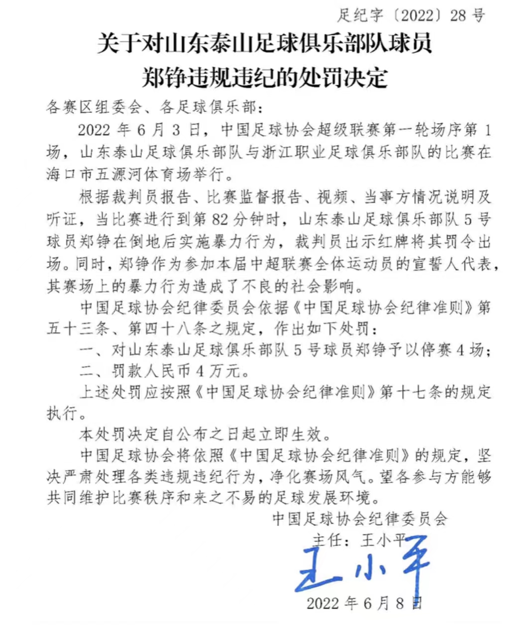6月3日,中国足球协会超级联賽第一轮场序第1场,山东泰山与浙江队的比赛在海口市五源河体育场举行。根据裁判员报告、比賽监督报告、视频、当事方情况说明及听证,当比赛进行到第82分钟时,山东泰山足球俱乐部队球员郑铮在倒地后实施暴力行为,裁判员出示红牌将其罚令出场。 同时,郑铮作为参加本届中超联赛全体运动员的宣誓人代表,其赛场上的暴力行为造成了不良的社会影响。中国足球协会纪律委员会依据《中国足球协会纪律准则》第五十三条、第四十八条之规定, 对郑铮予以停赛4场,罚款人民币4万元的处罚。