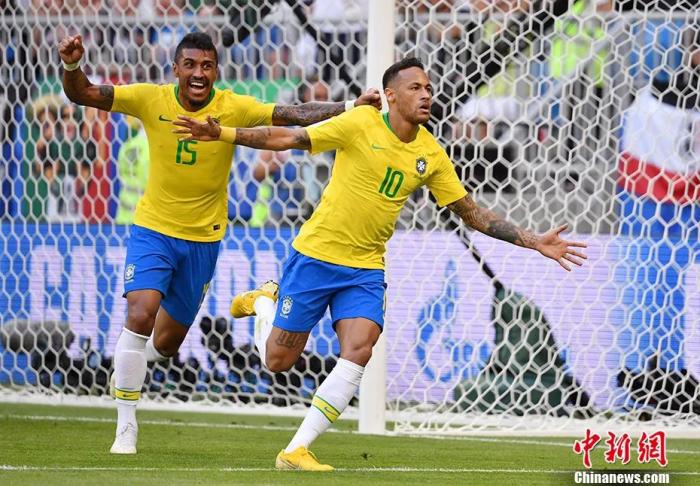 巴西队在俄罗斯世界杯中,图为内马尔庆祝进球。中新社记者 毛建军 摄