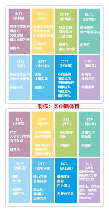 INTJ(策划者) 沉稳但不缺乏想象力 关键时刻总能做出正确决断 德国队 如果说德国队是INTJ,恐怕是最没争议的。严谨、沉稳、坚韧,这是“日耳曼战车”留下的烙印。论个人技术,德国球员也不处于下风,想象力、创造力十足。因此在稳定的下限与不低的上限加持下,德国队常常能在大赛中有着亮眼发挥。 ENTP(辩手) 头脑灵活敏捷 讨厌做常规和重复的事情 比利时队、荷兰队 与捏合在一起会形成强大合力的德国队不同,荷兰球员和比利时球员大多有很强的个性,且天赋十足,并不愿意循规蹈矩,上限非常高,这也造就了不少特点鲜明的球星。但反过来,由于普遍特立独行,大赛中的比利时队和荷兰队,往往在拥有很强阵容实力的情况下,没有取得应有的成绩和荣誉。 ENFP(活动家) 随意自由、有想象力、充满热情 巴西队、塞内加尔队 在热情、开朗、明快以及极具想象力的足球风格之下,绿茵场上极具天赋的桑巴舞者巴西队总能赏心悦目。拥有马内、门迪等顶级球星的塞内加尔队,亦是如此。 中新社记者 毛建军 摄" style="border-width: 0px; border-style: initial; vertical-align: middle; max-width: 700px; cursor: pointer;">