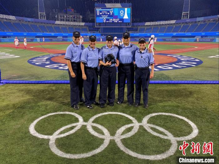 于志玲(右二)在东京奥运垒球决赛场与当值技术官员团队合影。 于志玲供图