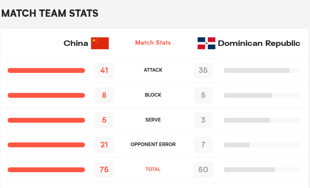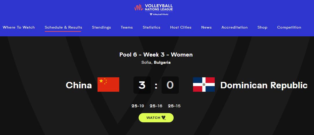 经过开场的适应和试探之后,实力占优的中国女排逐渐将比赛纳入到自己熟悉的节奏中,以25:19顺利先下一局。 次局比赛,多米尼加队攻势有所加强,不过中国女排立刻给予回应,连续得分后反超至9:6。领先的中国队始终占据优势,最终以25:16再赢一局。 第三局,攻势不减的中国女排以8:3开局。多米尼加队在攻防两端都难以给中国队带来实质性威胁,分差也越拉越大。25:15,中国女排轻松拿下比赛。