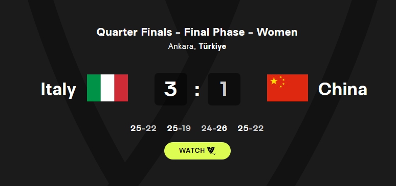 此前分站赛中,中国女排交出8胜4负的成绩单排名第4位,提前1轮锁定总决赛资格。 出征前,主教练蔡斌曾表示,“世界女排联赛,我们第一步要进入前八,然后再继续往前冲。”虽然球队未能进入4强,但蔡斌和女排姑娘们已经兑现了承诺。 聚焦比赛 本场比赛前,中国女排上一次负于对手,要追溯到2018年女排世锦赛半决赛。此前分站赛中,中国女排曾3:1战胜对手,但彼时对方头号球星埃格努未在阵中。 此番再度碰面,中国女排更快进入状态,对埃格努的针对性防守迫使对方频繁出现失误。局中,埃格努的发球轮帮助意大利队扭转局势,以25:22先下一城。 次局比赛,意大利队在局中抓住反击机会取得领先,在埃格努的发球轮,中国女排出现卡轮现象。第二局比赛,意大利队以25:19取胜。