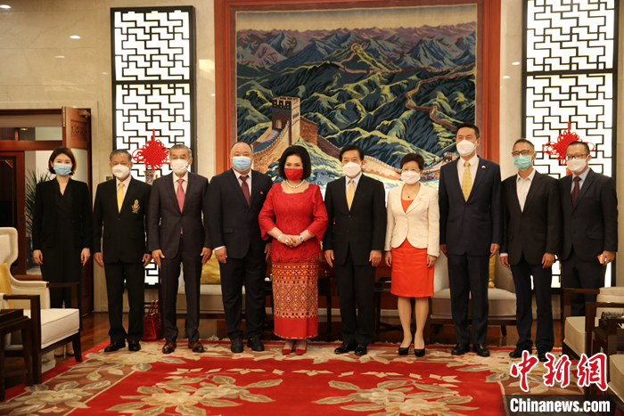 7月15日,中国驻泰国大使韩志强(右五)在曼谷会见国际奥委会委员、泰国羽毛球协会主席帕塔玛女士(左五),中国羽毛球协会主席张军(左四)一行,并见证中泰两国羽毛球协会签署首个合作谅解备忘录。 中新社发 赵婧楠 摄