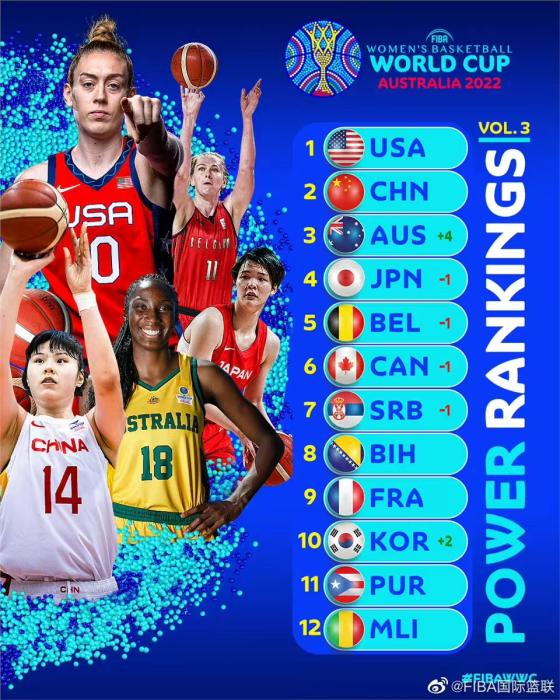 中新网北京8月19日电 北京时间19日,国际篮联发布2022年女篮世界杯实力榜,美国队名列榜首,中国队力压澳大利亚队排名第二。2022年女篮世界杯将于9月22日至10月1日在澳大利亚悉尼举行,中国队与比利时、波黑、波多黎各、韩国和美国队同在A组。(完)