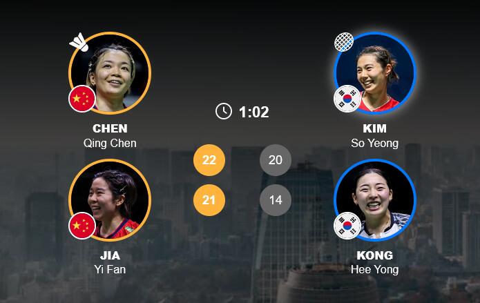 金昭映/孔熙容率先拿到局点。不过在19:20落后的情况下,陈清晨/贾一凡丝毫没有手软,连得三分完成逆转,以22:20拿下首局。