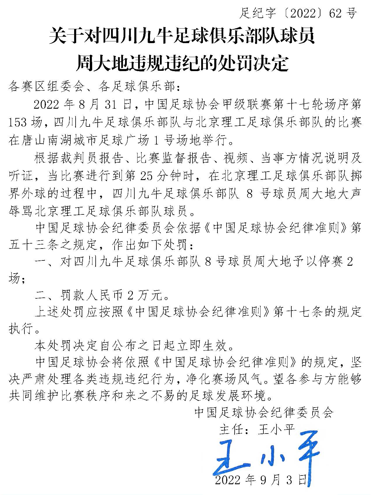 据中国足球协会官方网站消息,2022年8月31日,中国足球协会甲级联赛第十七轮场序第153场,四川九牛足球俱乐部队与北京理工足球俱乐部队的比赛中,四川九牛足球俱乐部队8号球员周大地大声辱骂北京理工足球俱乐部队球员,被罚停赛2场,罚款人民币2万元。