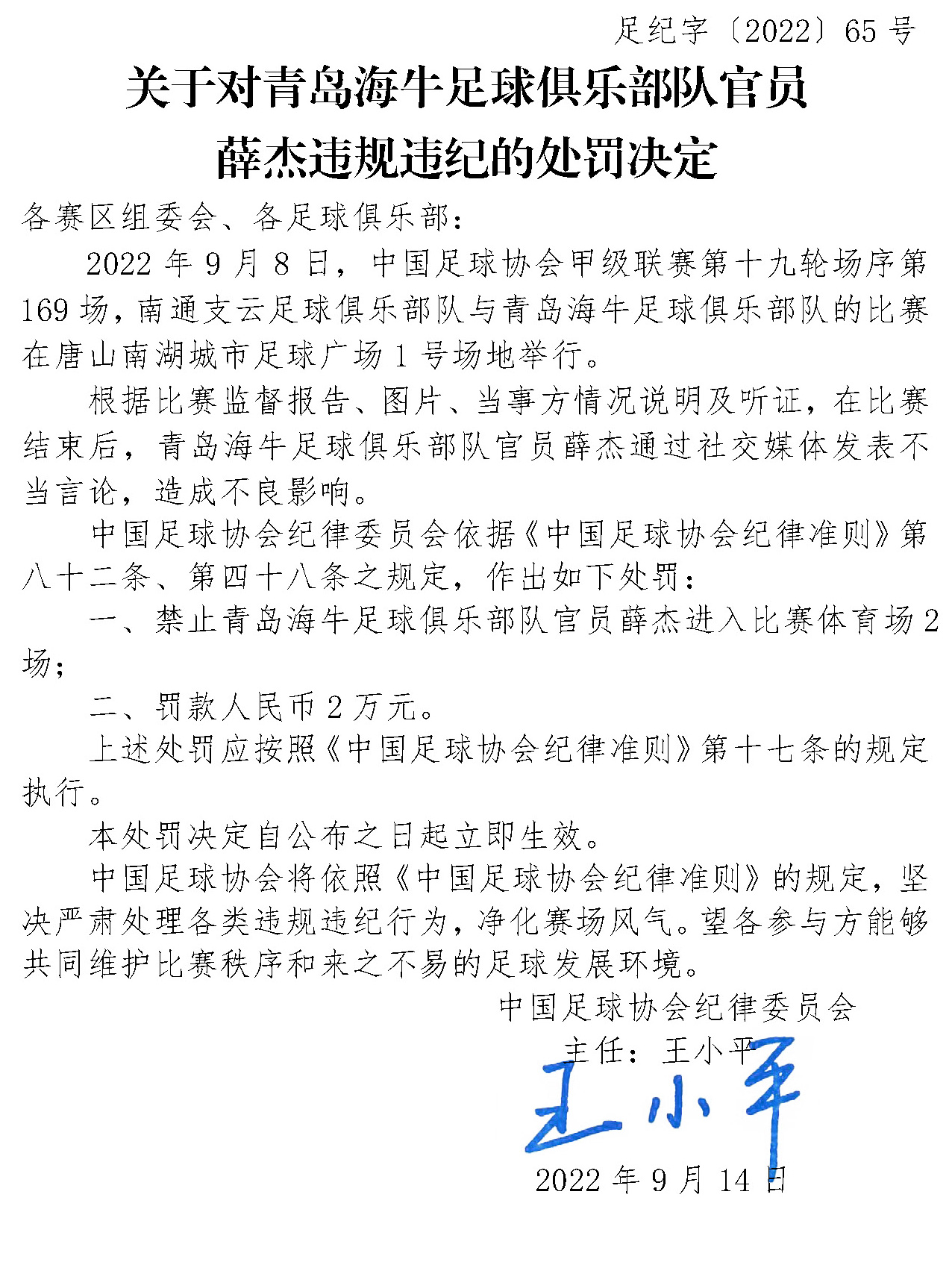 《关于对青岛海牛足球俱乐部队官员薛杰违规违纪的处罚决定》指出,2022年9月8日,在中国足球协会甲级联赛第十九轮,南通支云足球俱乐部队与青岛海牛足球俱乐部队的比赛结束后,青岛海牛足球俱乐部队官员薛杰通过社交媒体发表不当言论,造成不良影响。 依据《中国足球协会纪律准则》第八十二条、第四十八条之规定,中国足球协会纪律委员会给予薛杰禁止进入比赛体育场2场、罚款人民币2万元的处罚。