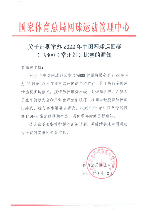 《通知》指出,2022年中国网球巡回赛CTA800常州站原定于2022年9月23日至30日在江苏常州网球中心举行。鉴于当前全国疫情出现多地散发,疫情防控形势严峻,为保障参赛、办赛人员生命健康安全和正常生产生活秩序,根据当地疫情防控部门建议,经与赛事组委会研究,决定2022年中国网球巡回赛CTA800常州站延期举办。具体举办时间另行通知。