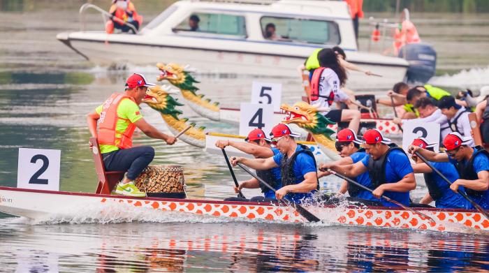 9月17日,由北京市社会体育管理中心及丰台区体育局联合主办的2022年北京市龙舟大赛在卢沟桥晓月湖公园举行。赛事根据水域环境设男女混合龙舟200米直道竞速赛项目,共有来自北京市各区的23支代表队近400名运动员参赛,这些运动员包括社区居民、机关干部、乡镇农民、企业职工、高校学生、国际友人等社会各界代表。 北京市龙舟大赛创办于2009年,每年举办一届,今年已是第十四届。在声声鼓点中,选手们提桨、腰背发力、破水,动作整齐划一,强劲有力,艘艘龙舟劈波斩浪,直奔终点,充分发扬了体育人顽强拼搏、昂扬奋进的风貌,展示了首都北京全民健身事业发展的成果。 经过预赛、决赛两轮激烈比拼,北京市大兴区水上运动协会队以总分第一的优异成绩斩获冠军,亚军和季军则分别花落北京东城TBT队和TBT希爱沐吉龙舟队。