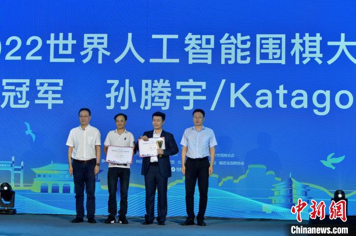 图为9月29日晚,嘉宾为获得2022世界人工智能围棋大赛冠军的孙腾宇七段与Katago组合颁奖。 张斌 摄