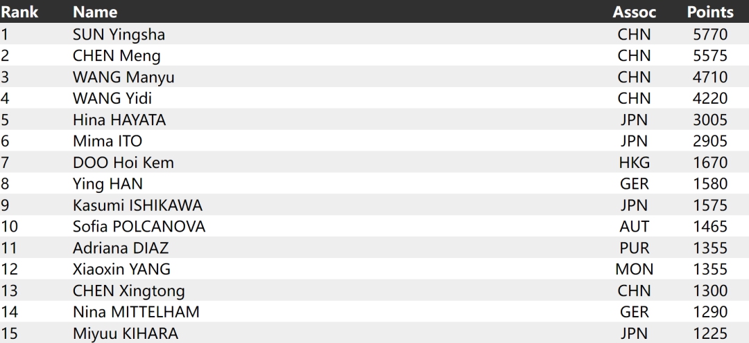 比赛进程 决赛前,两队队员都表达了内心的期待,直言会享受比赛。而这场决赛也正如大家预想般的那样精彩。 首盘比赛,陈梦在面对木原美悠时,不断用发球冲击对手,增加前三板球的变化,占据场上主动。最终以3:0击败对手,为中国队拿下第1分。 次盘比赛,王曼昱对阵伊藤美诚。二人局势较为胶着,前两局互有胜负。此后,王曼昱在关键分的把握上更胜一筹,以3:1战胜对手。 第三盘比赛,孙颖莎面对世界排名并不高的长崎美柚,完全占据场上主动,没有给对手太多的机会,3:0战胜对手拿下胜利。 夺冠之路 本次世乒赛,中国女团的战绩最终定格在了8胜0负。 由于德国队、韩国队等老对手处于新老交替时期,所以中国队以全胜战绩夺冠,不少网友其实已有预料。回顾队伍夺冠之路,不少画面令外界津津乐道。 小组赛阶段,由于对手实力整体偏弱,中国队在排兵布阵上显得更加灵活。首次参加世乒赛团体赛的王艺迪、陈幸同也在不同场次获得了出场机会,同样表现得游刃有余。 而在比赛之余,女团队员也显得很是“忙碌”,她们会去接受各方的合影邀约。 美国队的14岁小将林伊轩偶像是王曼昱,当她和后者一起在训练场练球并成功收获合影后,小姑娘开心地笑了。