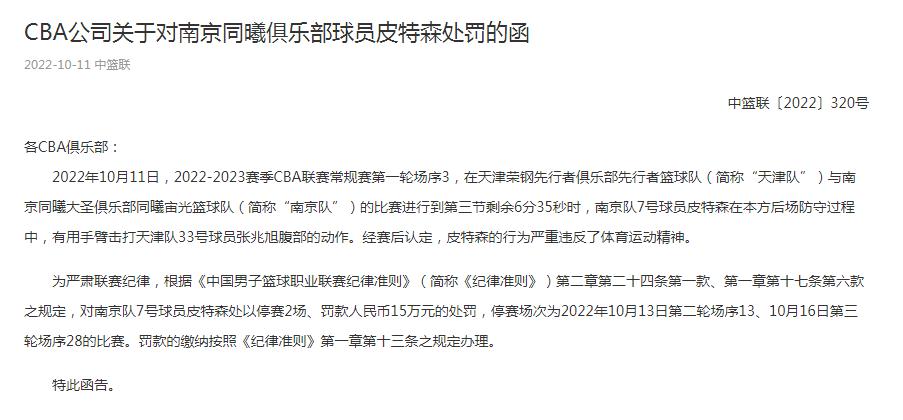 CBA联赛网站消息,11日进行的天津队与南京队的CBA常规赛中,南京外援皮特森用手臂击打天津队33号球员张兆旭腹部,被处以停赛2场,罚款15万元人民币。