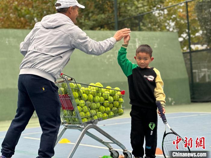 图为王发六岁的弟弟王艺正在教练的指导下练习网球动作。 郑晨子 摄