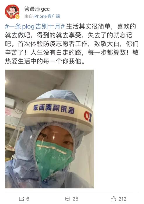 中新网10月31日电 31日,东京奥运会体操冠军管晨辰在微博发布了自己做防疫志愿者的照片,并配文:“生活其实很简单,喜欢的就去做吧,得到的就去享受,失去了的就忘记吧。首次体验防疫志愿者工作,致敬大白,你们辛苦了!人生没有白走的路,每一步都算数!敬热爱生活中的每一个你我他。”