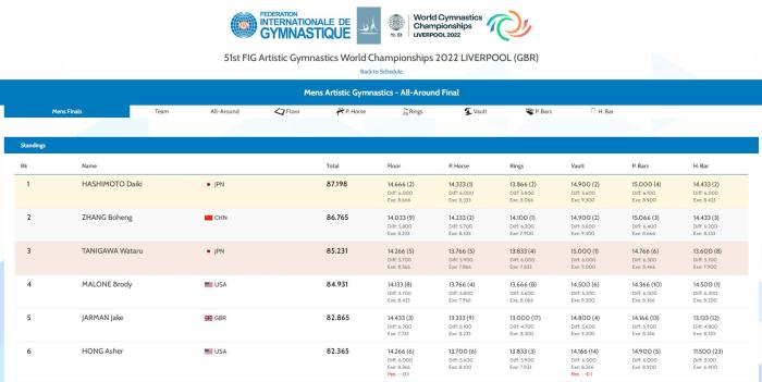 北京时间11月5日凌晨,2022利物浦世界体操锦标赛举行男子个人全能决赛。日本选手桥本大辉拿下冠军,中国选手张博恒以总分86.765分的成绩摘获银牌,日本选手谷川航屈居季军。