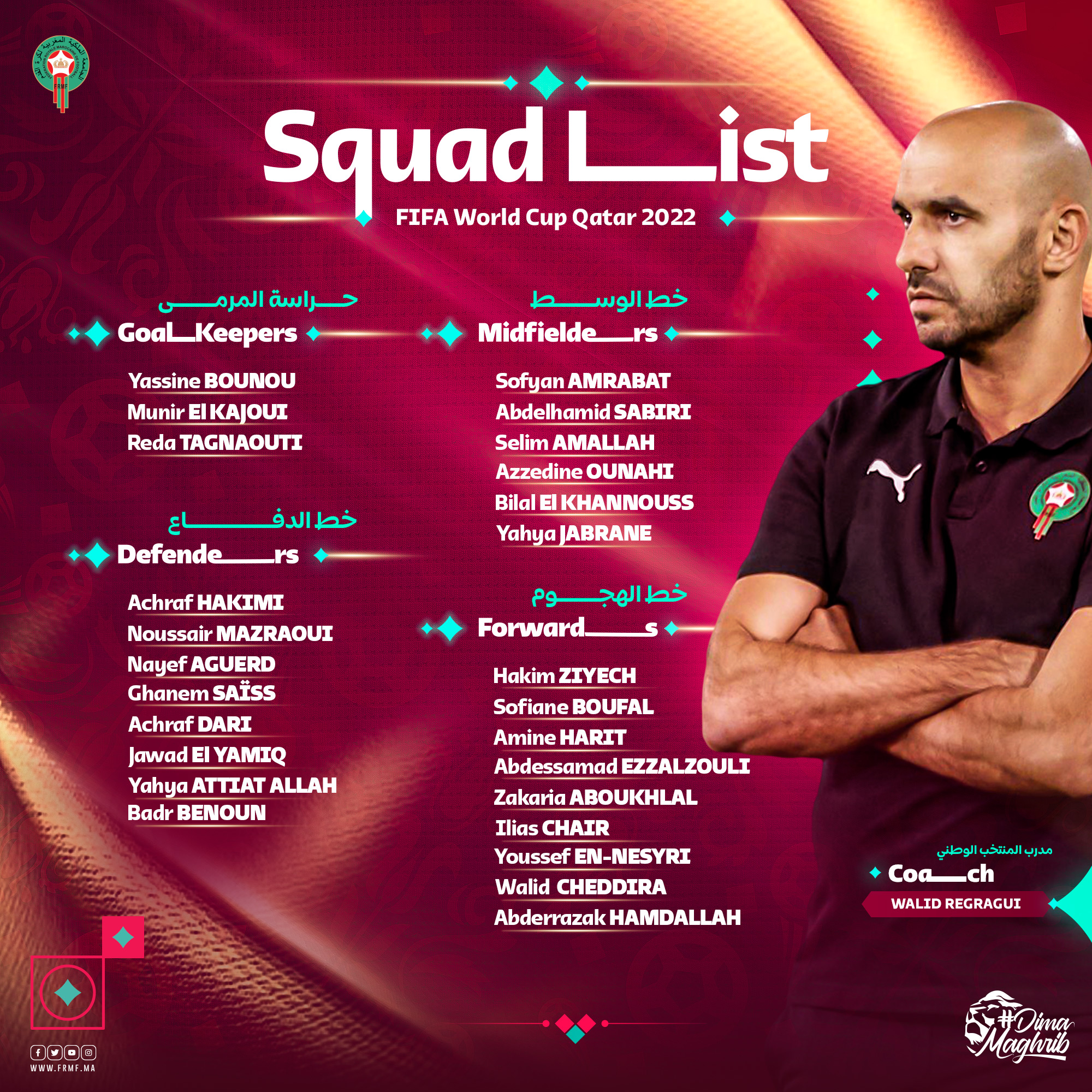 北京时间10日晚,摩洛哥国家队公布了卡塔尔世界杯26人大名单,齐耶赫与阿什拉夫领衔,马兹拉维在列。摩洛哥队本届世界杯与克罗地亚、比利时、加拿大同组。
