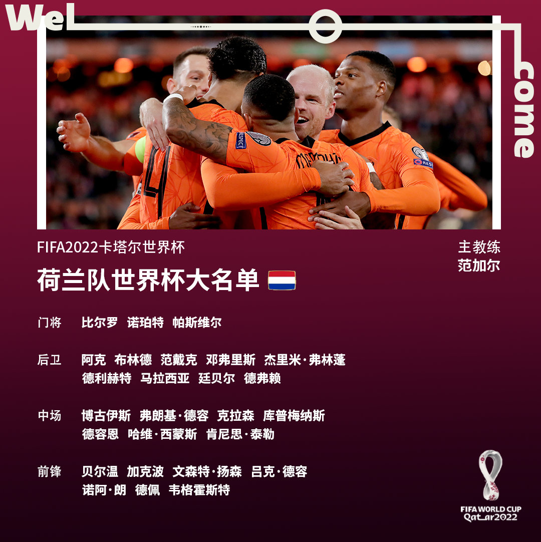 具体名单如下: 门将 拜洛(24岁/费耶诺德)、诺珀特(28岁/海伦芬)、帕斯维尔(39岁/阿贾克斯) 后卫 范迪克(31岁/利物浦)、阿克(27岁/曼城)、布林德(32岁/阿贾克斯)、廷伯(21岁/阿贾克斯)、邓弗里斯(26岁/国际米兰)、德弗里(30岁/国际米兰)、德利赫特(23岁/拜仁)、马拉西亚(23岁/曼联)、弗林蓬(21岁/勒沃库森) 中场 F-德容(25岁/巴塞罗那)、博古伊斯(30岁/阿贾克斯)、克拉森(29岁/阿贾克斯)、库普梅纳斯(24岁/亚特兰大)、加克波(23岁/埃因霍温)、德容恩(31岁/亚特兰大)、肯尼斯-泰勒(20岁/阿贾克斯)、哈维-西蒙斯(19岁/埃因霍温) 前锋 德佩(28岁/巴塞罗那)、贝尔温(25岁/阿贾克斯)、文森特-延森(28岁/安特卫普)、L-德容(32岁/埃因霍温)、诺阿-朗(23岁/布鲁日)、韦霍斯特(30岁/贝西克塔斯) 本届世界杯,荷兰队与塞内加尔、卡塔尔、厄瓜多尔同组。北京时间22日0:00,荷兰将对阵塞内加尔,26日0:00迎战厄瓜多尔,29日23:00对阵东道主卡塔尔。(完)