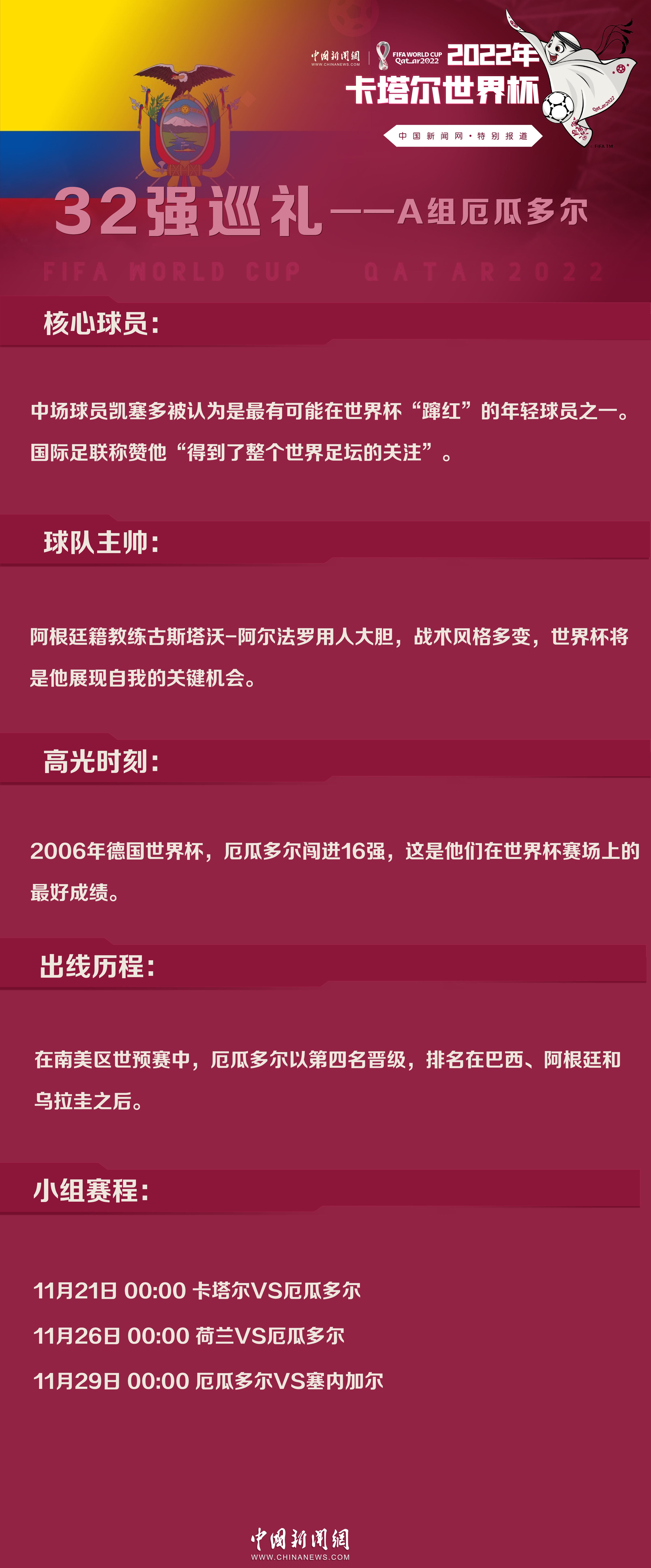 球队名单: 门将:亚历山大-多明戈斯、加林德斯、韦林顿-拉米雷斯。 后卫:埃斯图皮尼安、阿雷亚加、因卡皮耶、安赫洛-普雷西亚多、波罗索、迭戈-帕拉西奥斯、菲利克斯-托雷斯、阿沃莱达、帕乔。 中场:莫伊塞斯-凯塞多、格鲁埃索、阿兰-佛朗、 门德斯、萨缅托、西富恩特斯、贡萨洛-普拉塔、罗马里奥-伊瓦拉、安赫尔-梅纳、爱德华-普雷西亚多。 前锋:恩纳-瓦伦西亚、埃斯特拉达、雷亚斯科斯、凯文-罗德里格斯。 核心球员: 现效力于英超布莱顿的中场球员凯塞多已经成为欧洲多家豪门追逐的对象。包括皇马、曼联、利物浦等多家俱乐部都将他作为明年夏窗的目标。国际足联对他也不吝溢美之词,在官网称赞凯塞多“得到了整个世界足坛的关注”。这名技术全面的天才球员也被外界认为是最有可能在世界杯“蹿红”的年轻球员之一。 球队主帅: 阿根廷教练古斯塔沃-阿尔法罗于2020年起正式执教厄瓜多尔队。在成为厄瓜多尔队主帅之前,阿尔法罗还曾担任阿根廷豪门博卡青年队主帅。尽管阿尔法罗与世界一流教练之间仍有差距,但他用人大胆,战术风格多变。即将到来的卡塔尔世界杯将是他展现自我的关键机会。 高光时刻: 2006年德国世界杯,厄瓜多尔队闯进16强,这成为他们在世界杯赛场上的最好成绩。小组赛中,他们先后击败了波兰和哥斯达黎加,成功晋级下一轮。不过在八分之一决赛,厄瓜多尔队遭遇英格兰队,倒在了贝克汉姆的圆月弯刀之下。 出线历程: 在南美区的2022世界杯预选赛中,厄瓜多尔队以第四名晋级,排名在巴西、阿根廷和乌拉圭队之后。其中,他们战平南美两大豪门巴西和阿根廷,接着又4:2大胜乌拉圭,最终以7胜5平6负积26分晋级卡塔尔世界杯决赛圈。 小组赛程:(以下时间为北京时间) 11月21日 00:00 卡塔尔-厄瓜多尔 11月26日 00:00 荷兰-厄瓜多尔 11月29日 00:00 厄瓜多尔-塞内加尔
