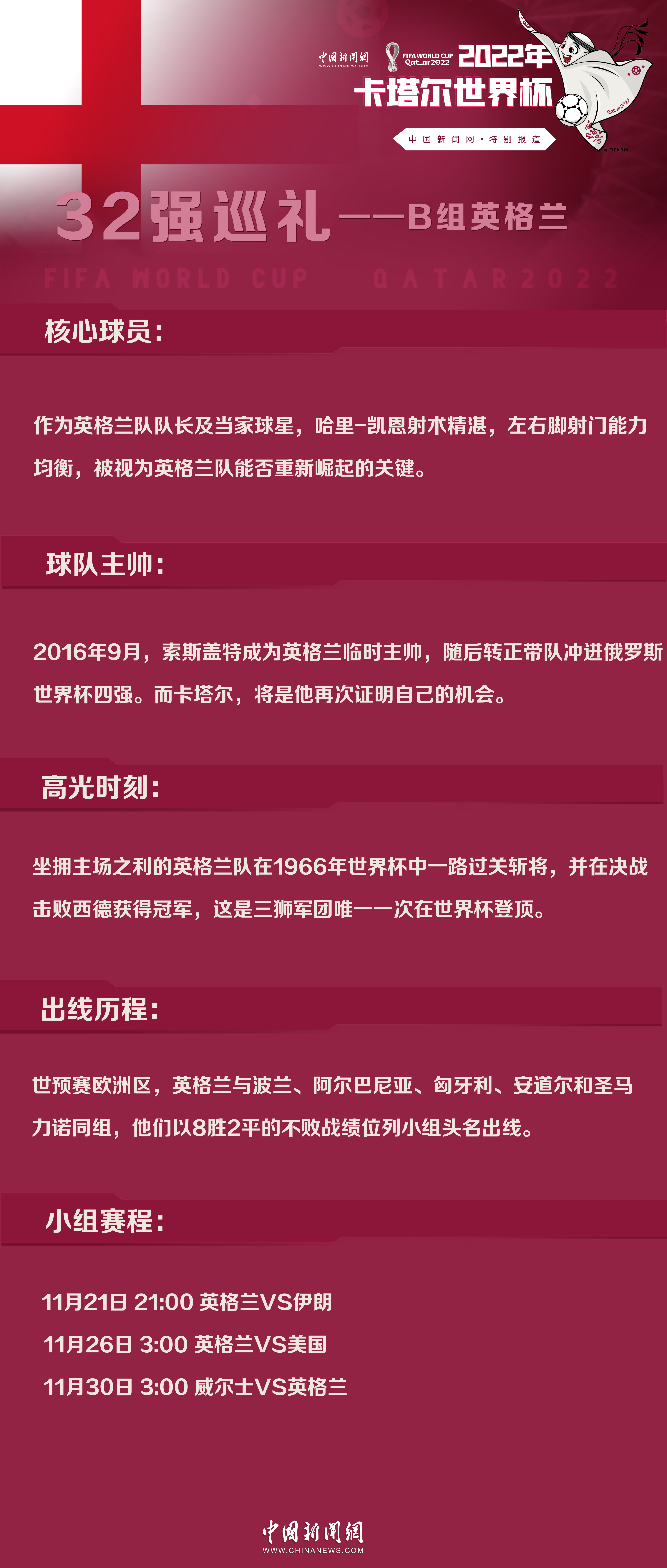 球队主帅: 球员时代的加雷斯-索斯盖特曾代表英格兰队出场57次。2016年9月,在阿勒代斯下课后,索斯盖特成为英格兰临时主帅,随后转正带队冲进俄罗斯世界杯。 至今,索斯盖特已经带领英格兰征战2018年俄罗斯世界杯和2020年欧洲杯两届大赛,分别获得四强和亚军的成绩。尽管如此,外界对他战术和用人不当的批评仍不绝于耳。卡塔尔世界杯将是索斯盖特证明自己的机会。 高光时刻: 坐拥主场之利的英格兰队在1966年世界杯中一路过关斩将闯入决赛,那支球队云集了查尔顿、班克斯等巨星。凭借赫斯特在加时赛中的两粒进球,英格兰队在最终决战中击败西德获得冠军,这也是迄今为止三狮军团唯一一次在世界杯中登顶。 出线历程: 卡塔尔世界杯预选赛中,英格兰与波兰、阿尔巴尼亚、匈牙利、安道尔和圣马力诺同组,他们最终以8胜2平的不败战绩位列小组头名晋级世界杯决赛圈。 小组赛程: 11月21日 21:00 英格兰vs伊朗 11月26日 3:00 英格兰vs美国 11月30日 3:00 威尔士vs英格兰