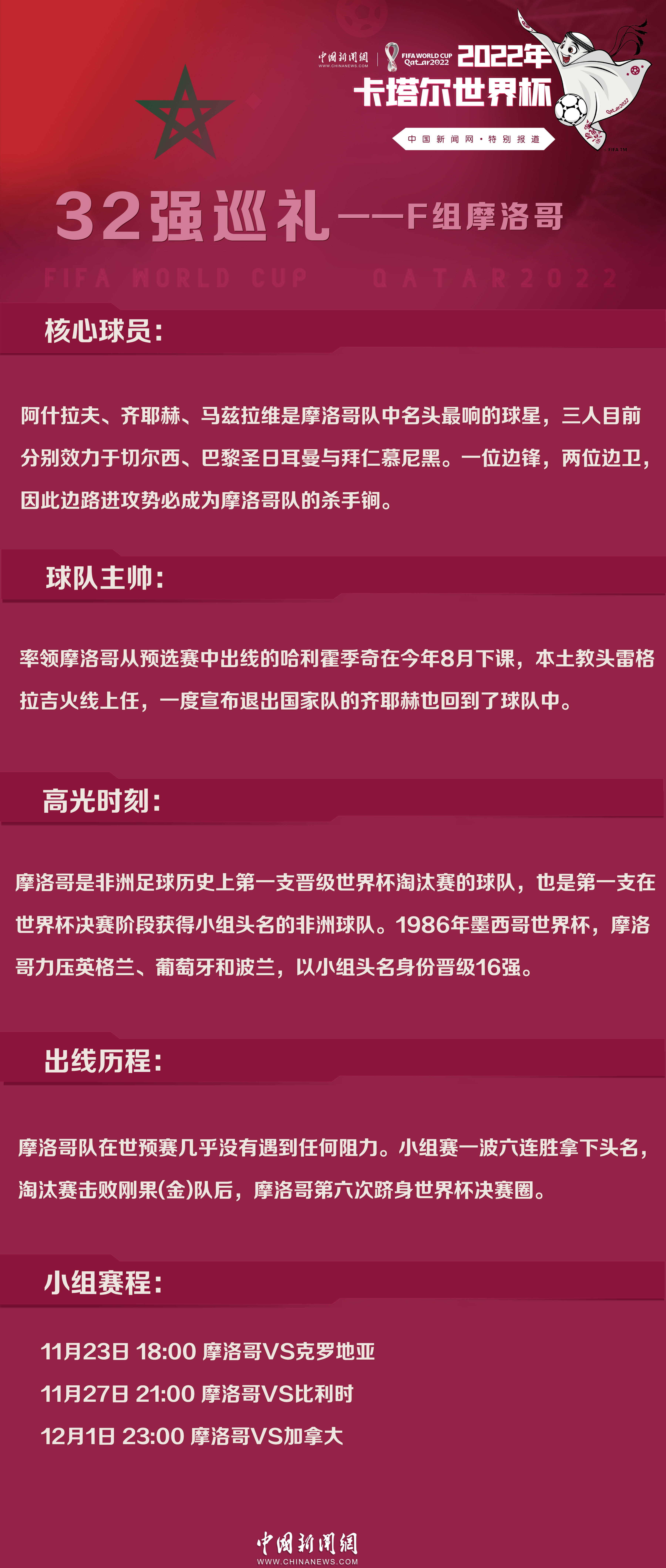 球队名单: 门将:布努、穆尼尔、塔纳乌蒂 后卫:阿什拉夫、马兹拉维、赛斯、阿格尔德、达里、埃尔亚米克、叶海亚·阿拉、巴农 中场:阿姆拉巴特、阿马拉、萨比里、欧纳希、哈努斯、贾布拉内 前锋:齐耶赫、内斯里、布法尔、阿布赫拉尔、阿布德、谢尔、阿里、哈姆达拉、谢迪拉 核心球员: 阿什拉夫、齐耶赫、马兹拉维是这支摩洛哥队中名头最响的球星,三人目前分别效力于切尔西、巴黎圣日耳曼与拜仁慕尼黑。他们之中一个是边锋,两个是边卫,因此边路进攻势必成为摩洛哥队的杀手锏。 球队主帅: 率领摩洛哥队从卡塔尔世界杯预选赛中出线的是老帅哈利霍季奇,但将率队征战世界杯的是雷格拉吉。 由于队内矛盾,哈利霍季奇在今年8月“下课”,摩洛哥本土教头雷格拉吉火线上任,一度宣布退出国家队的齐耶赫也回到了球队中。 对于一支球队而言,大赛前临阵换帅肯定会带来一定影响,这需要球队上下协力去弥缝。好在47岁的雷格拉吉在摩洛哥国内拥有很高声望,他率领维达德在今年非洲足球冠军联赛中折桂。 高光时刻: 摩洛哥是非洲足球历史上第一支晋级世界杯淘汰赛的球队,也是第一支在世界杯决赛阶段获得小组头名的非洲球队。 在1986年的墨西哥世界杯中,摩洛哥小组赛力压英格兰、葡萄牙和波兰队,以小组头名身份晋级16强。尽管之后被联邦德国队淘汰,但摩洛哥依然为非洲足球书写了历史。 出线历程: 摩洛哥队在卡塔尔世界杯预选赛中几乎没有遇到任何阻力。小组赛一波六连胜拿下头名,淘汰赛击败刚果(金)队后,摩洛哥第六次跻身世界杯决赛圈。 小组赛赛程(北京时间): 11月23日 18:00 摩洛哥vs克罗地亚 11月27日 21:00 摩洛哥vs比利时 12月1日 23:00 摩洛哥vs加拿大