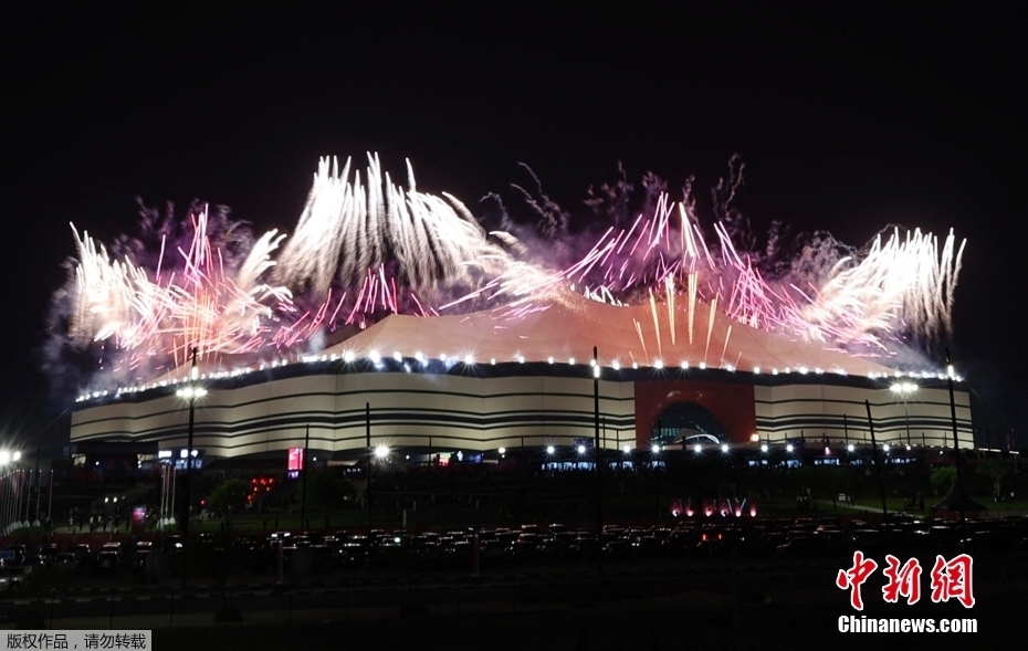 当地时间11月20日,2022年卡塔尔世界杯开幕式在海湾球场举行。图为海湾球场上空烟花绽放。