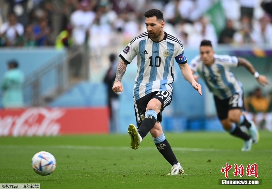 当地时间11月22日,卡塔尔世界杯小组赛C组首轮第一场,阿根廷对阵沙特阿拉伯的比赛正式打响,这也是梅西第5次世界杯的首秀。图为梅西攻入本届世界杯首球。