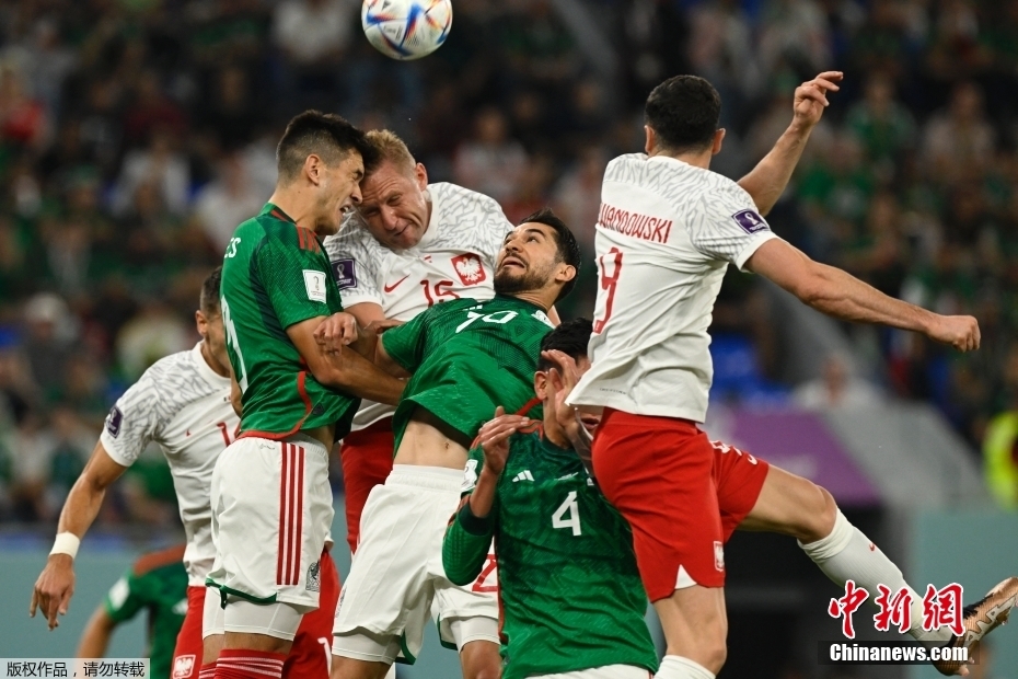 当地时间11月22日,世界杯小组赛C组首轮第二场,墨西哥对战波兰的比赛在卡塔尔974球场打响。图为双方球员在比赛中争抢头球。